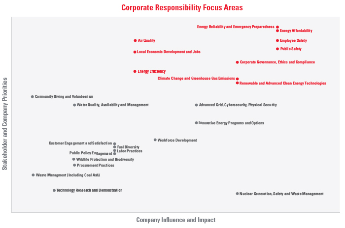 In early 2017, using the Global Reporting Initiative methodology to guide us, we conducted an online survey with nearly 1,000 stakeholders to understand which issues are currently most important to the individuals and organizations within our service territory, as well as within our own organization. The results are provided in the chart below.