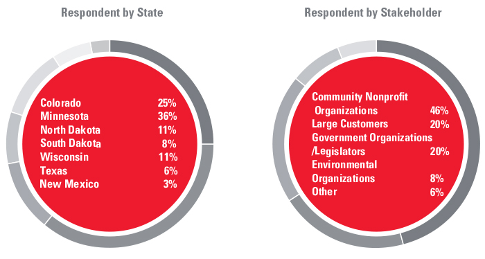 The corporate responsibility survey was conducted internally and designed to have stakeholders identify their top priorities for Xcel Energy’s corporate responsibility efforts. Xcel Energy’s executive leadership also answered the survey to understand our internal priorities. Altogether, the survey was distributed to nearly 1,000 internal and external stakeholders across our eight-state service territory. Approximately 26 percent of potential respondents participated. The respondents represented a good mix of our local stakeholder categories and our service territory.
